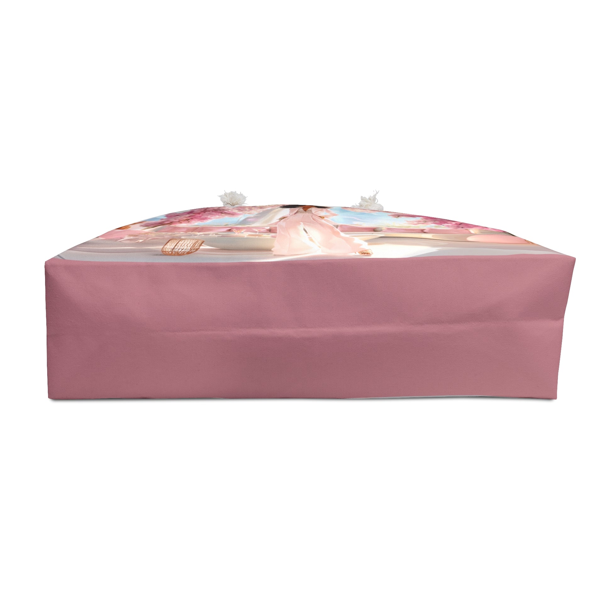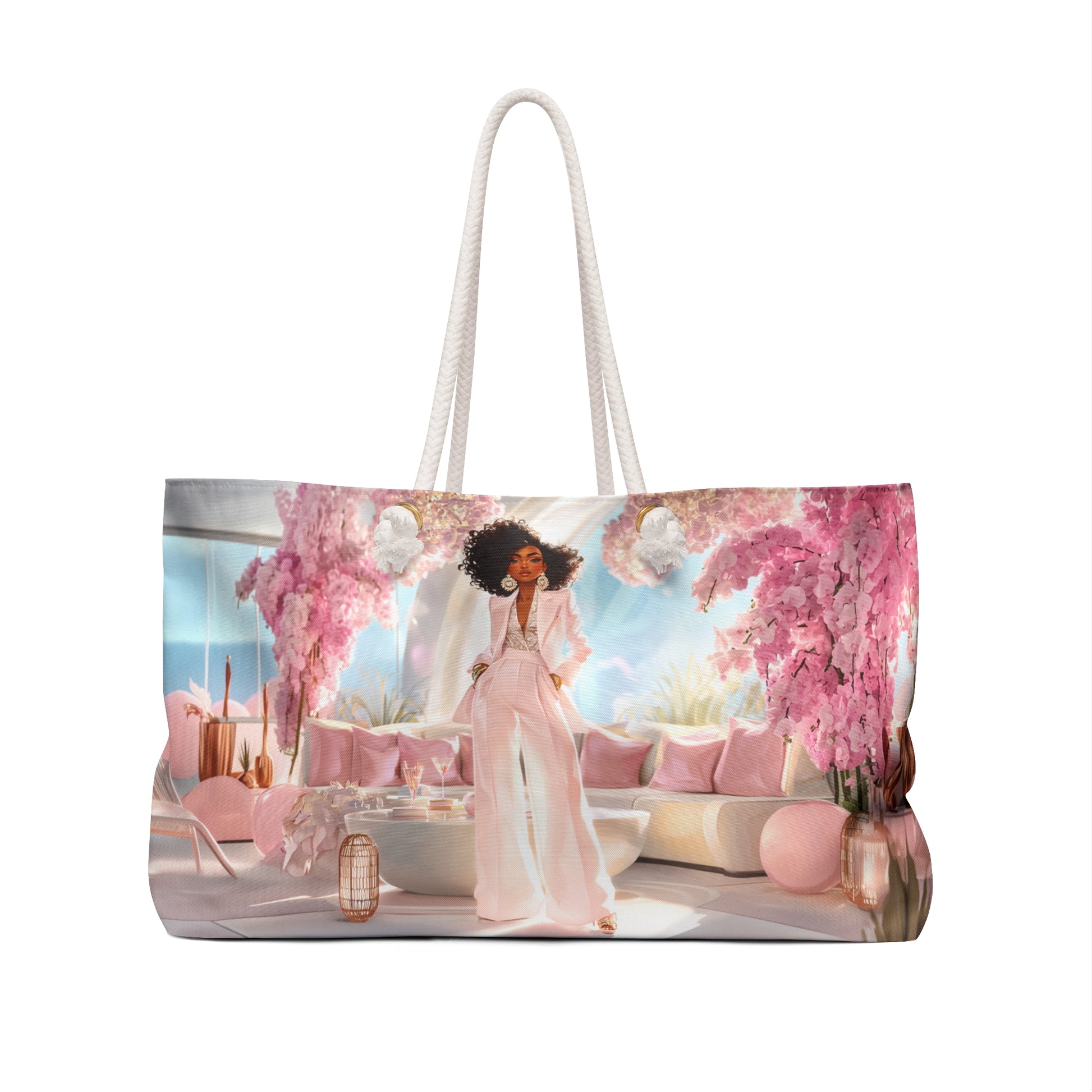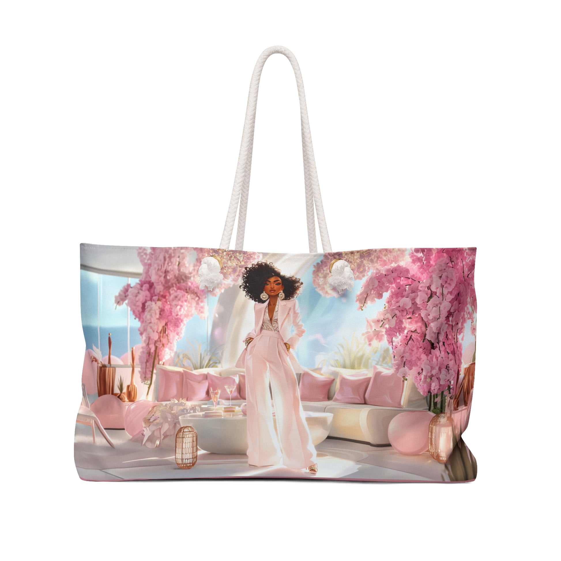 Dripping in pink perfection, the Pink Luxe Lounge Weekender Tote captures the essence of modern glam with a soft, feminine twist. This bag features a radiant illustration of a powerful woman adorned in blush tones, confidently posing in an ultra-luxury lounge framed by cascading cherry blossoms and plush decor.
